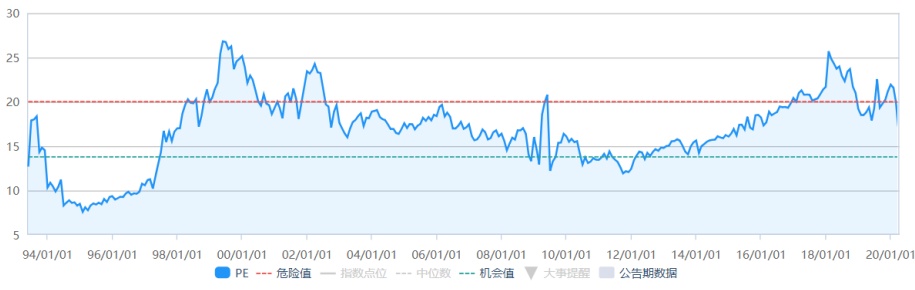 图:1994-2020,道指PE,当前值距离09年低点还有不小距离 来源WIND