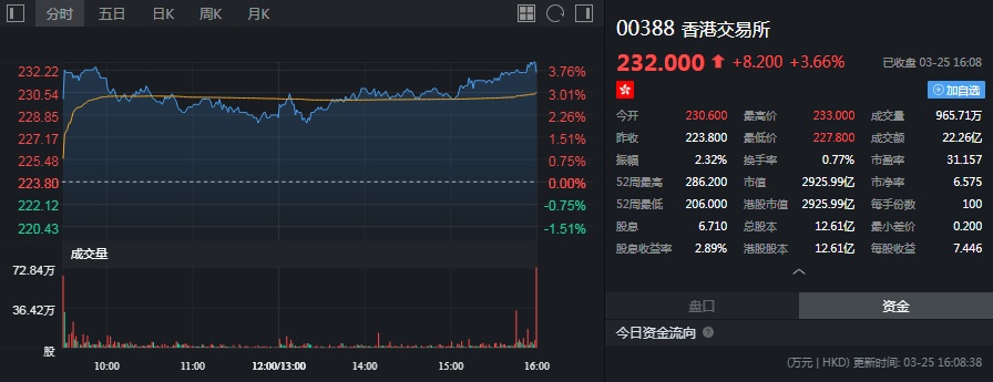 智通财经APP获悉,联交所最新资料显示,3月20日,摩根大通增持港交所(00388)408.3561万股,每股作价219.0079港元,总金额约为8.94亿港元。增持后最新持股数目约为1.15亿股,最新持股比例9.11%。