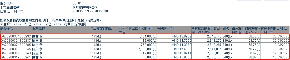 智通财经APP获悉,联交所最新资料显示,恒隆集团(00010)执行董事陈文博3月持续增持该公司股票,16至19日,以及20日和23日共6日时间,陈文博共增持497.3万股,总金额约为7315万港元,增持后持股数目约为26.44亿股,持股比例为58.78%。