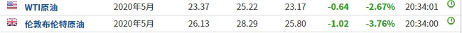 截至发稿,WTI原油跌2.67%,报23.37美元/桶。布伦特原油跌3.76%,报26.13美元/桶。