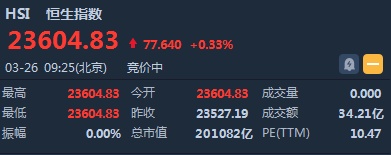 智通财经APP获悉,恒生指数开盘涨77.64点或0.33%,报23604.83点。国企指数跌0.81%,报9452.1点。红筹指数跌0.88%,报3532.9点。大市盘前成交34.21亿港元。