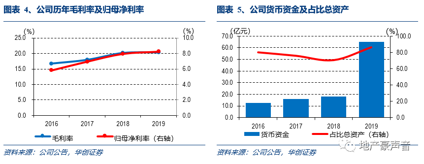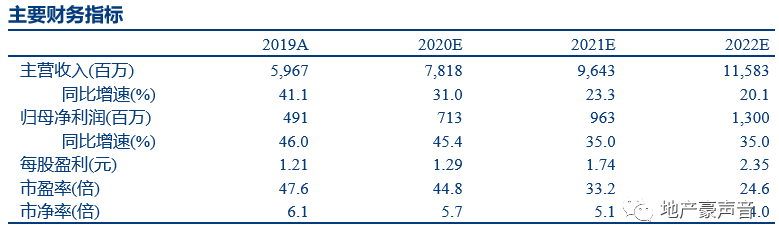 2019年,公司实现营业收入59.7亿元,同比+41.1%;实现毛利润12.1亿元,同比+42.2%;实现归母净利润4.9亿元,同比+49.3%;基本每股收益1.21元,同比+47.6%;毛利率和归母净利率为20.3%和8.2%,同比分别+0.2pct和+0.3pct;少数股东损益比2.6%,同比+0.3pct。2016-19年,公司营收、归母净利CAGR分别达32.5%、44.8%。截至19年末,公司现金及现金等价物达65.1亿元,同比+262.9%;合约负债达9.4亿元,同比+33.0%,体现了公司较好的预收情况,并预计将一定程度上助力物业服务收入的快速增长。2019年,经营活动产生的现金流量净额为6.9亿元,同比+60.5%,回款情况良好。此外,公司拟每股分红0.3元,分红率为33.8%。