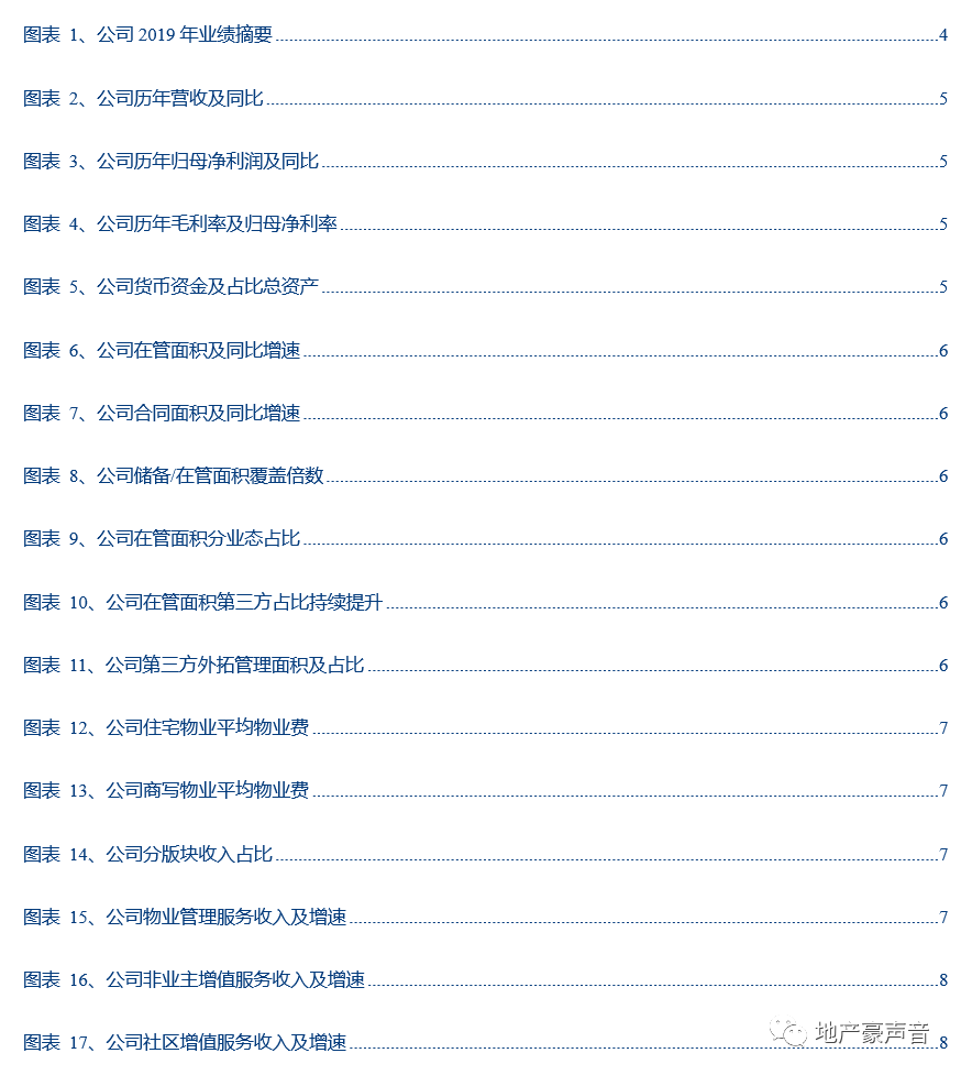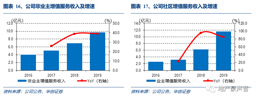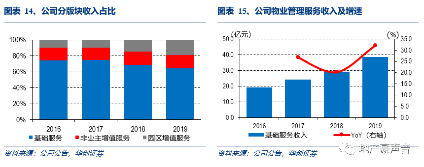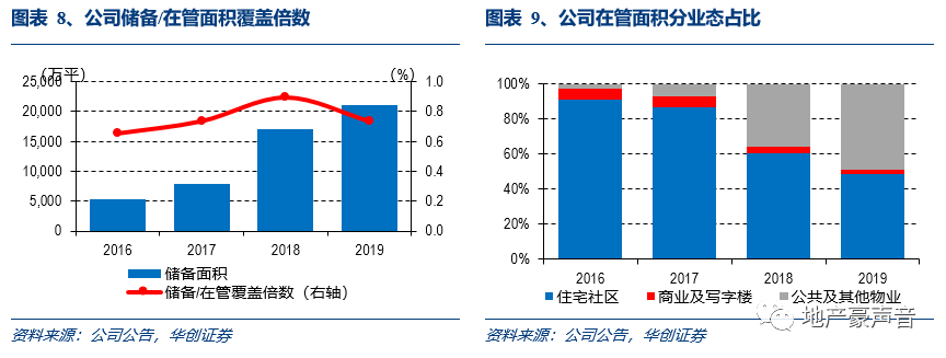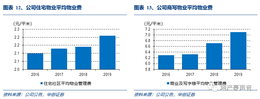 2019年末,公司在管面积达2.87亿平米,同比+50.6%,较2019H1末+10.2%;合同面积达4.98亿平米,同比+37.8%,较19H1末+9.5%;合同/在管覆盖率达1.7倍,较2019H1末持平。2016-19年,在管面积、合同面积CAGR分别达51.9%、54.4%。2019年末,公司在管面积中:1)内生(来自保利地产)、外拓分别占比44.9%、55.1%,分别同比-12.5、+12.5pct;2)住宅、非住宅分别占比48.4%、51.6%,分别同比-12.3、+12.3pct;非住宅中,商写、公共物业分别占比2.7%、48.9%;2016-19年住宅、非住宅在管CAGR分别达23%、175%。2019年,公司住宅、商写物业费单价分别为2.21、7.10元/平米,分别同比提升0.07、0.39元/平米。鉴于保利地产销售高增,后续有望为公司持续输血,并公司积极布局非住宅业态,央企背景资源优势突出,有望助力公司管理规模持续高增。