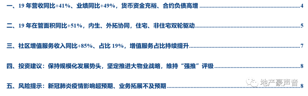 19年,保利物业(06049)实现营业收入59.7亿元,同比+41.1%;实现毛利润12.1亿元,同比+42.2%;实现归母净利润4.9亿元,同比+49.3%;基本每股收益1.21元,同比+47.6%;毛利率和归母净利率为20.3%和8.2%,同比分别+0.2pct和+0.3pct;少数股东损益比2.6%,同比+0.3pct。16-19年,公司营收、归母净利CAGR分别达32.5%、44.8%。截至19年末,公司现金及现金等价物达65.1亿元,同比+262.9%;合约负债达9.4亿元,同比+33.0%,体现了公司较好的预收情况,并预计将一定程度上助力物业服务收入的快速增长。19年,公司经营活动产生的现金流量净额为6.9亿元,同比+60.5%,回款情况良好。此外,公司拟每股分红0.3元,分红率为33.8%。