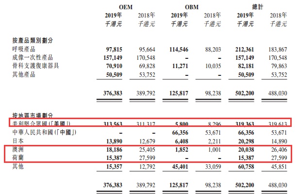 报表来看,呼吸机业绩整体保持较好。更让人惊讶的是,按区域划分,永胜医疗的收入大部分来着海外,比如美国贡献了3.19亿港元、日本贡献2029万港元、澳洲约2004万港元、荷兰1538万港元。简单来说,基本上是做出口,而要知道,在2019年外贸环境无此复杂之下,美国等地仍是该公司主要供货地区,间接说明其有一定实力。