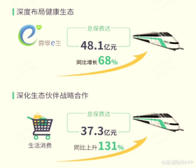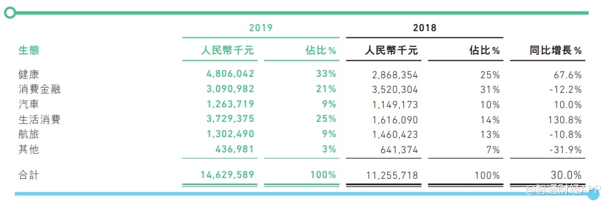 2019年,五大生态业务——健康、消费金融、生活消费、汽车、航旅生态总保费分别占公司总保费的33%、21%、25%、9% 及9%,其中健康和生态消费生态增长势头强劲,同比增长率分别达到67.6%及130.8%,因此与2018年相比,这两大生态的保费占比也显著提升。