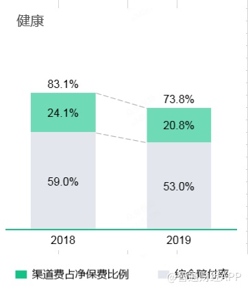“有质量地增长”追求的是增长与利润兼得。过去一年,众安缩减了渠道费率较高的航旅生态业务,以及承保质量较低的健康团险,使得综合成本率明显改善,尤其是健康生态,赔付率及渠道费率分别同比下降6.0个百分点、3.3个百分点,至53.0%及20.8%。如果更进一步分析2019年上下半年的数据,可以发现,健康生态的赔付率,在2019年下半年已经下降至48%,足足比2018年低了10个百分点。
