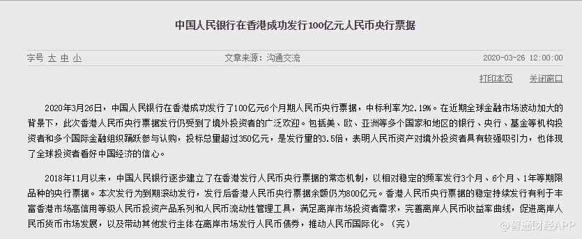 智通财经APP获悉,据央行官网消息,2020年3月26日,中国人民银行在香港成功发行了100亿元6个月期人民币央行票据,中标利率为2.19%。在近期全球金融市场波动加大的背景下,此次香港人民币央行票据发行仍受到了境外投资者的广泛欢迎。包括美、欧、亚洲等多个国家和地区的银行、央行、基金等机构投资者和多个国际金融组织踊跃参与认购,投标总量超过350亿元,是发行量的3.5倍,表明人民币资产对境外投资者具有较强吸引力,也体现了全球投资者看好中国经济的信心。