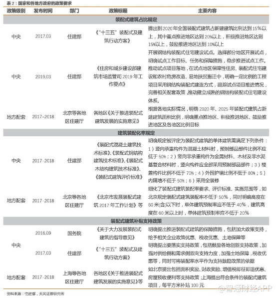 装配式建筑具有建造速度快、节能环保、强度高等优点,且能极大降低污染和资源浪费,顺应绿色制造与节能。此外,装配式建筑承担着生态文明补短板和钢铁、水泥、建材等行业去库存的重任,发展装配式建筑是供给侧改革组合拳之一,因而推行装配式建筑与环保限产、供给侧结构性改革政策的需求相契合,各地各级政府出台了一系列关于装配式建筑的政策法规,以此来推动装配式建筑行业的发展,下表为国家和各地方政府近年来出台的主要相关政策要求: