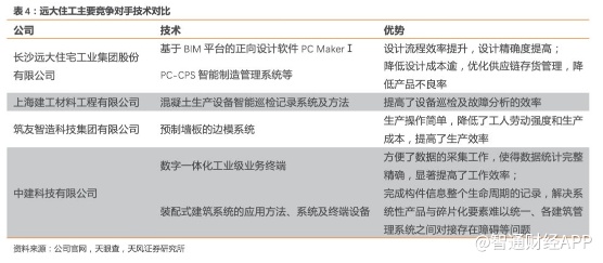 对比远大住工及其竞争对手所掌握的技术,远大住工主要基于装配式建筑设计、制造、施工和运维全产业链条的每一步,在智能服务平台方面进行了技术革新,形成了专有的技术体系。筑友智造科技和中建科技除数字化研究外,还在总承包管理方面进行了创新,如EMPC模式、REMPC模式。