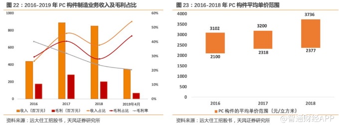PC构件毛利率水平有所下降,其一是因为原材料(钢筋、水泥和砂石)成本自2016年以来大幅回升。虽然PC构件厂商通常可通过价格调整向下游行业参与者转移原材料的价格波动,2016年至2018年期间全资工厂在中国不同地区销售的PC构件的平均单价范围整体呈小幅上升的趋势。但是由于公司在2018年以前以闭口合同形式承接订单,因而PC构件毛利仍会受到较大程度影响。其二是因为总包方和项目业主方沟通调整合同价格导致项目进度延后,PC构件的供应量并未完全释放。2019年,自营工厂产能开始提升,收入及毛利有所增长。