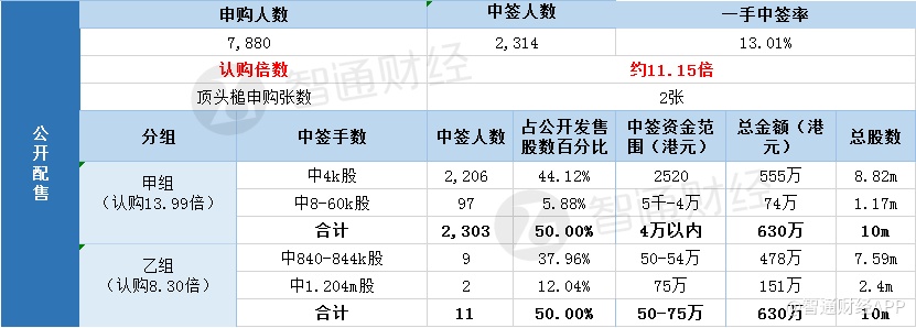 其中,公开配售申购人数7880,一手中签率13.01%,认购倍数约11.15倍。