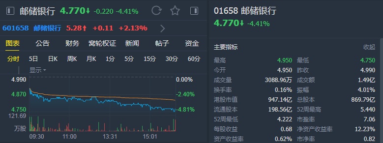该行重申邮储行“跑输大市”评级,基于内银股本成本上升,目标价自4.7港元调整至4.3港元。