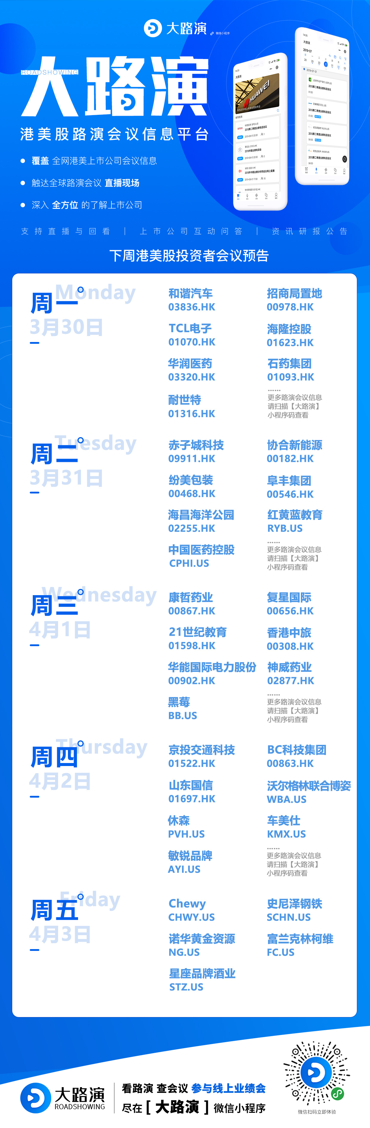 以下是智通财经“大路演”为您整理的下周(3月30日-4月3日)港美股上市公司会议日历。
