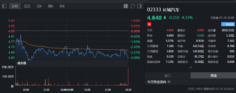 截至今日收盘,长城汽车跌4.33%,报4.64港元。