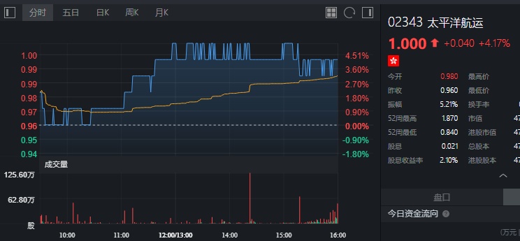 截至今日收盘,太平洋航运涨4.17%,报1港元。