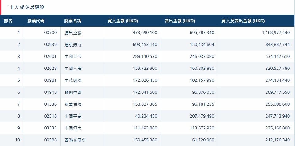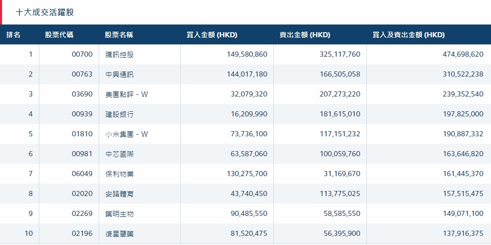 此外,中芯国际(00981)获净买入3339万港元,而中兴通讯(00763)遭净卖出2248万港元。