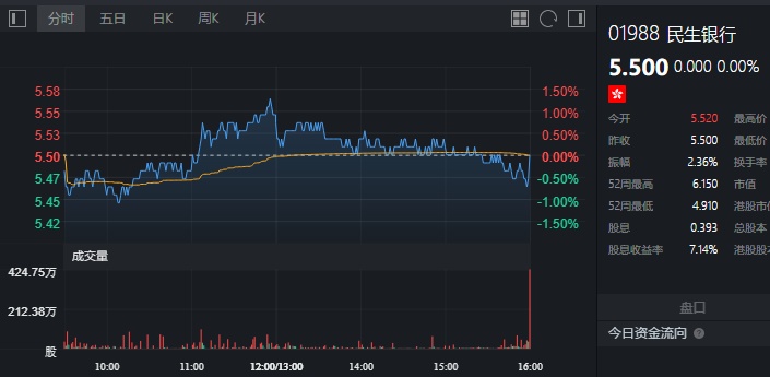 截至今日收盘,民生银行无涨跌,报5.5港元。