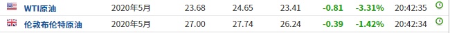 截至发稿,WTI原油跌3.31%,报23.68美元/桶。布伦特原油跌1.42%,报27.00美元/桶。