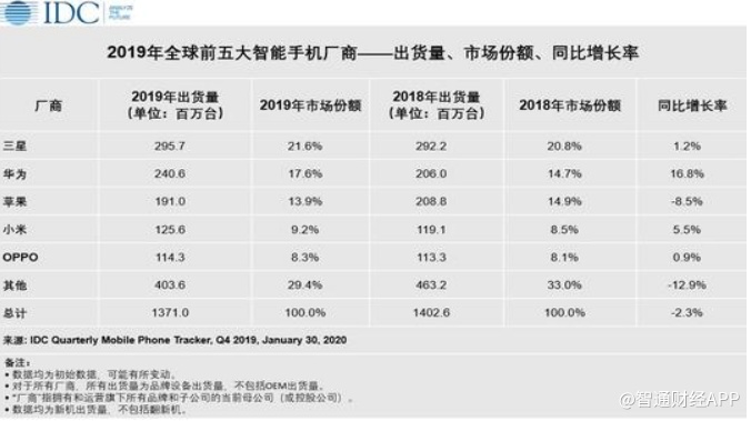 不管是真是假,先回顾2019年度全球智能手机排行榜,根据知名市场调研机构IDC发布的年2019年全球手机出货量榜单,三星依然稳居榜首,前五名依次为三星、华为、苹果、小米、OPPO。华为2.4亿台的年出货量居于第二,小米则以1.256亿台的年出货量排名第四。