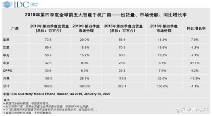 而从2019年第四季度全球手机出货量榜单来看,小米表现不俗,四季度出货量3280万台,实现同比增长31.1%。华为四季度出货量则为5620万台,虽然同比下跌7.1%但仍名列第三。