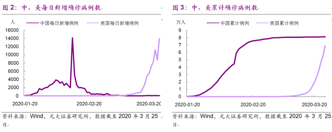 失业人数增加表明公共卫生事件对经济基本面的冲击开始显现。3月以来,美国本土确诊病例数快速增长,本周已有两天的每日新增病例数超过1万人,全美累计病例数也接近7万人,随着时间的推移,美国的累计病例数将大概率超过中国(图2-3)。