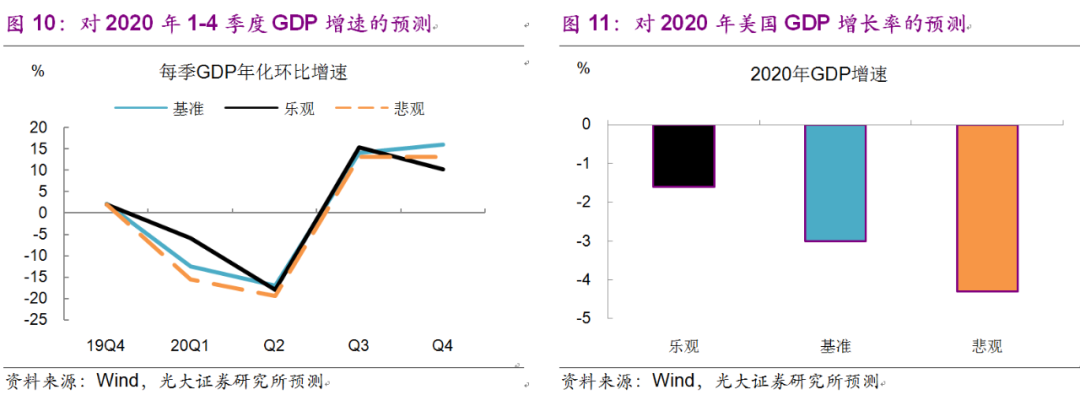 我们认为对失业人数大幅上升无需过度悲观。这次美国财政补贴力度很强,在财政救助的保障下,失业者的生活未必很差。不过,短期内就业人数下降难免拖累GDP增长。基准情形下,我们预计美国2020年1-4季度的失业率分别为至7.4%、10.6%、8.1%、4.9%,对应每季GDP增速(年化环比)分别为-12.6%、-17%、14%、16%,全年GDP增长-3%。