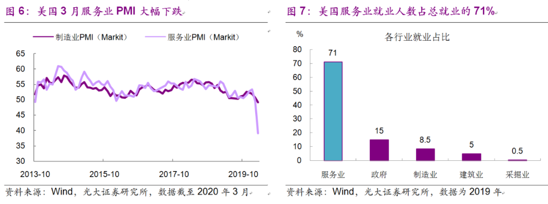 分行业看,公共卫生事件的冲击或主要体现在服务业。公共卫生事件蔓延后,人口流动下降,旅游、餐饮、酒店休闲等服务行业需求将会大幅下滑。一些证据表明,过去几周美国航空公司的客座率、餐饮企业的订单数都明显减少,而此前公布的3月Markit服务业PMI初值降至39.1,降幅远大于制造业PMI,也说明服务业受的影响更大(图6)。