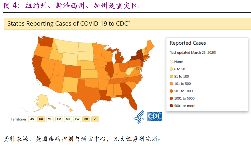 最新公布的美国3月第三周初次申请失业金人数为328万人,远高于市场预期,意味着后续美国失业率将显著上升。失业人数增加表明公共卫生事件对经济的冲击开始显现。分地区看,纽约州、新泽西州、加州是重灾区;分行业看,服务业受的影响较大,酒店休闲、餐饮、零售业就业或将下降较多。