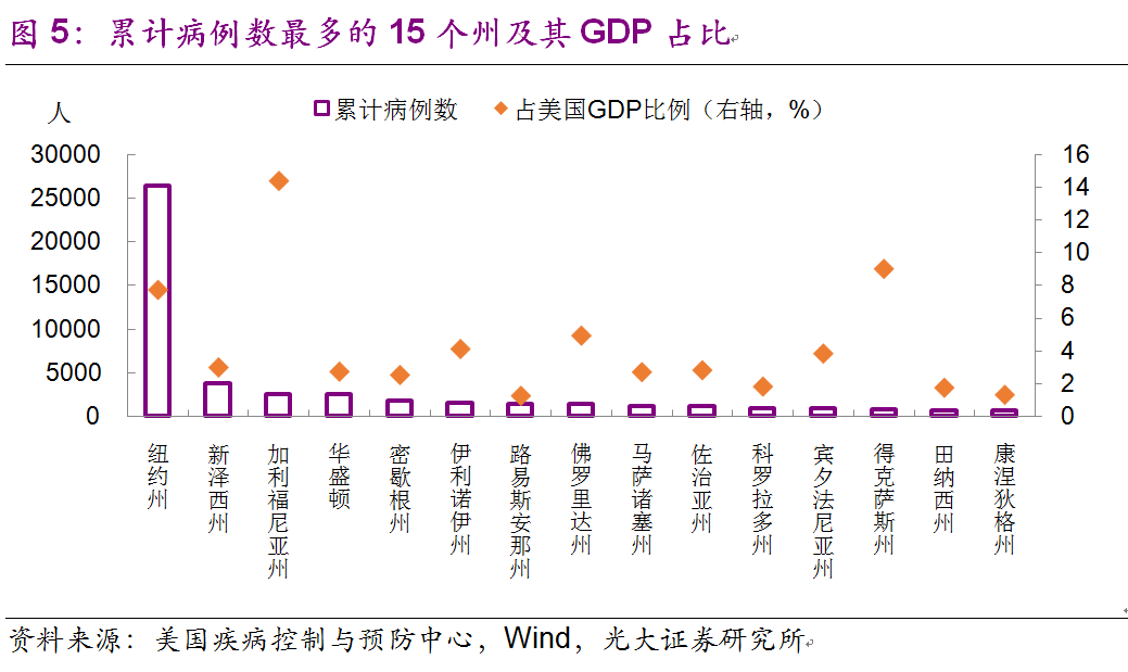 分地区看,纽约州、新泽西州、加州是重灾区,其中纽约州的累计病例数超过2.5万人,占全美病例数的三分之一(图4)。从GDP来看,纽约州和加州也是美国经济体量最大的地区之一,两者占美国GDP的比例分别为7.7%和14.4%(图5)。如果看公共卫生事件最严重的15个州,其GDP总和占美国GDP的63%。如今,美国已有40多个州进入紧急状态,居民被要求减少外出,经济活动被大幅削减,未来经济下滑将难以避免。