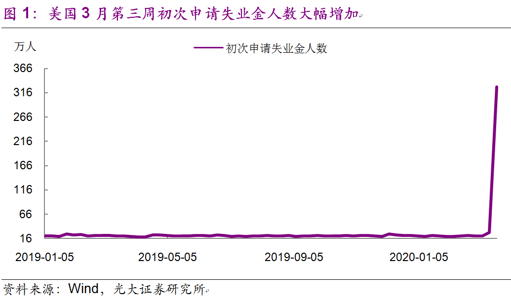 3月26日公布的美国3月第三周初次申请失业金人数为328万人,高于市场预期,也远高于次贷危机高峰时的70万人(图1)。初次申请失业金人数被视为失业率的先行指标,这意味着3月美国失业率也将显著上升。