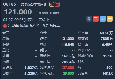 智通财经APP获悉,康希诺生物-B(06185)市前现大手成交,每股作价116.348元,涉及50.85万股,涉资5,916.06万元。截至发稿,康希诺生物平开,报121港元,成交额7395.7万港元。