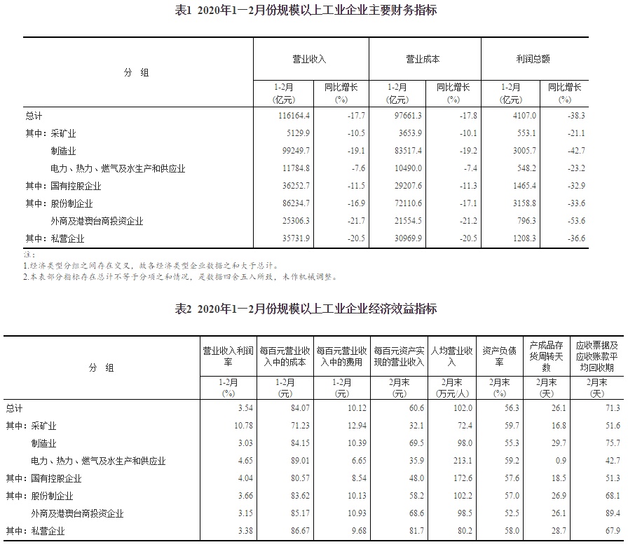 表1 2020年1-2月份规模以上工业企业主要财务指标