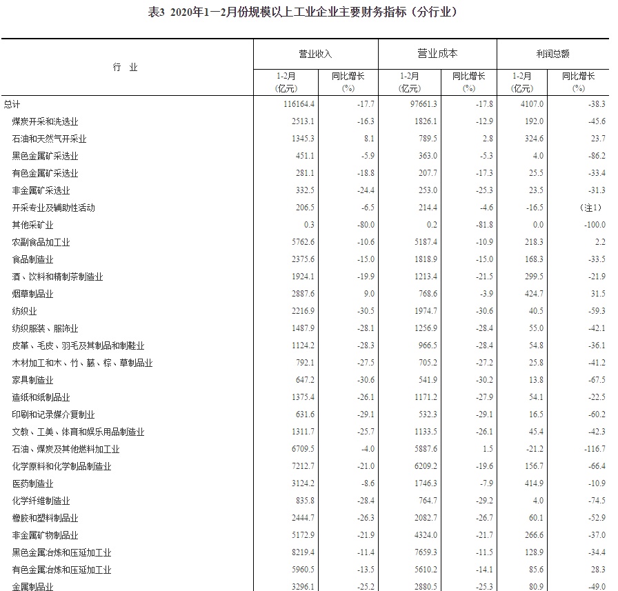 1-2月份,全国规模以上工业企业实现利润总额4107.0亿元,同比下降38.3%。