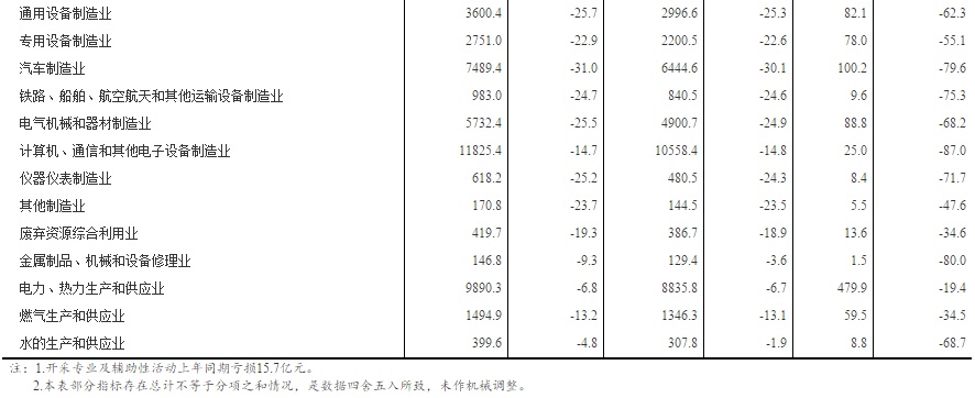 1-2月份,在41个工业大类行业中,4个行业利润总额同比增加,37个行业减少。主要行业利润情况如下:烟草制品业利润总额同比增长31.5%,有色金属冶炼和压延加工业增长28.3%,石油和天然气开采业增长23.7%,农副食品加工业增长2.2%,计算机、通信和其他电子设备制造业下降87.0%,汽车制造业下降79.6%,电气机械和器材制造业下降68.2%,化学原料和化学制品制造业下降66.4%,通用设备制造业下降62.3%,纺织业下降59.3%,专用设备制造业下降55.1%,煤炭开采和洗选业下降45.6%,非金属矿物制品业下降37.0%,黑色金属冶炼和压延加工业下降34.4%,电力、热力生产和供应业下降19.4%,石油、煤炭及其他燃料加工业由同期盈利转为亏损。