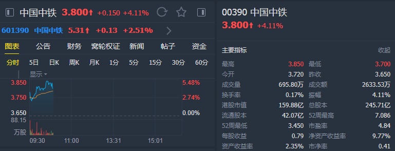 该行称,预计城市铁路、市政项目、房地产开发等毛利率较高业务收入比例今年将显著增加,因此将其目标价从6.8港元上调至7港元,并将A股上调至与H股一致的“增持”评级。