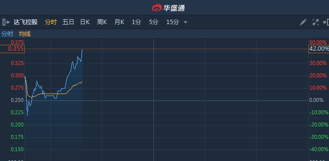 智通财经APP获悉,达飞控股(01826)早间发布公告称,不知悉股价不寻常波动原因,达飞云贷并非其附属。盘中股价大幅反弹,截至10时39分,涨42%,报价0.355港元,成交额1357万。