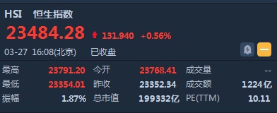 智通财经APP获悉,恒指早盘高开416.07点或1.78%,报23768.41点。截至收盘,恒生指数涨131.94点或0.56%,报23484.28点,全日成交额达1224.18亿。国企指数涨0.61%,报9504.92点,红筹指数涨0.62%,报3534.63点。
