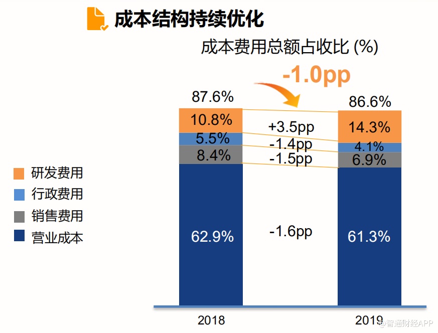 成本方面则整体呈现两个特点:一是成本控制更具效果,二是成本结构持续优化。2019年,公司销售和行政费用分别同比上年下降9.6%、16.8%;营业成本有7.1%的增长。相比之下,公司研发费用(剔除股权激励费用)于2019年大幅增加,同比提升45.5%。