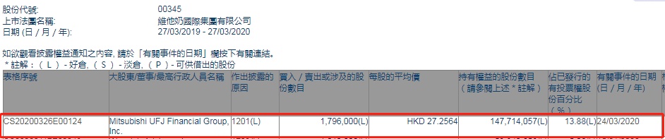 智通财经APP获悉,联交所最新资料显示,3月24日,三菱日联金融减持维他奶(00345)179.6万股,每股作价27.2564港元,总金额约为4895.25万港元。减持后最新持股数目约为1.48亿股,最新持股比例为13.88%。