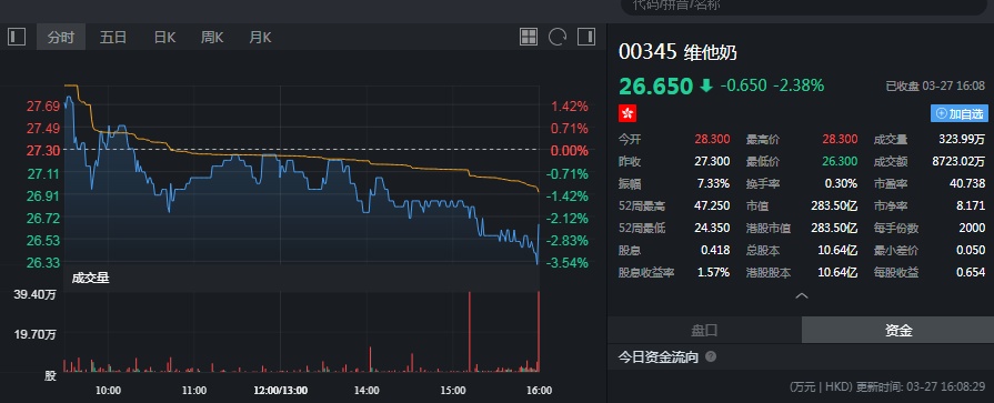 截至今日收盘,维他奶跌2.38%,报26.65港元。