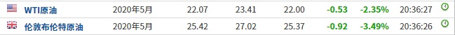 截至发稿,WTI原油跌2.35%,报22.07美元/桶。布伦特原油跌3.49%,报25.42美元/桶。