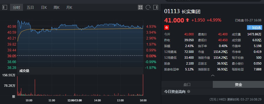 截至今日收盘,长实集团涨4.99%,报41港元。