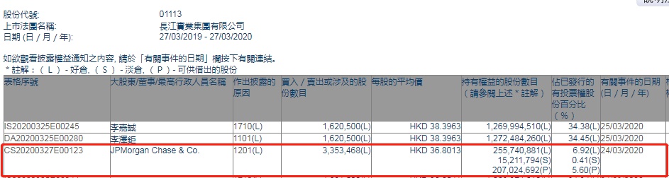 智通财经APP获悉,联交所最新资料显示,3月24日,摩根大通减持长实集团(01113)335.3468万股,每股作价36.8013港元,总金额约为1.23亿港元。减持后最新持股数目约为2.56亿股,最新持股比例为6.92%。