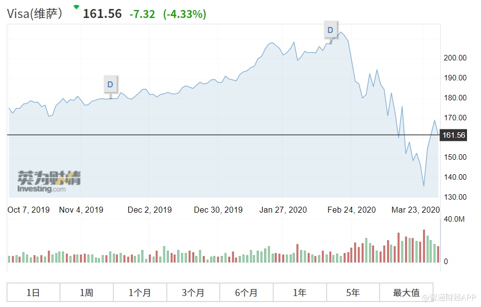 Visa不是贷方,它只是促进两方之间的付款,因此在这种熊市中,Visa的风险要小得多。它不必担心违约的风险,一旦近期危机结束并且经济恢复正常,Visa的股价也将会立即出现反弹。周五收盘,Visa的收盘价为161.56美元,较近期高点下跌约24%。