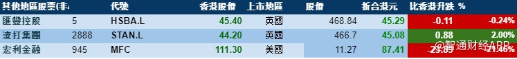 重磅蓝筹股全线向下,腾讯收报376.56港元,较港收市跌5.84港元;友邦收报66.7港元,较港收市涨2.05港元;香港交易所收报228.11港元,较港收市跌6.49港元;;汇丰控股收报44.78港元,较港收市跌0.62港元。