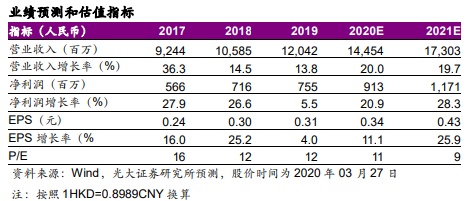 20-21 年净利润预测分别为 9.1/11.7 亿元人民币,对应 19-21E CAGR 约 25%;考虑到公司潜在股票期权行权影响,下调 20-21 年 EPS 预测分别至 0.34/0.43 元,对应 19-21E CAGR 约 18%。传统外包业务恢复较快增长、叠加云智能业务放量,公司整体业绩有望于 20 年重回快速增长轨道;受益华为鲲鹏生态推进,公司云智能业务高速成长性、确定性更有保障,参考公司传统外包业务主导时期的历史 PE 估值区间 9-16 倍,后续平台化、云端转型顺利兑现有助公司估值提升,维持目标价7.1港币(对应20/21年19/15 倍 PE),维持“买入”评级。