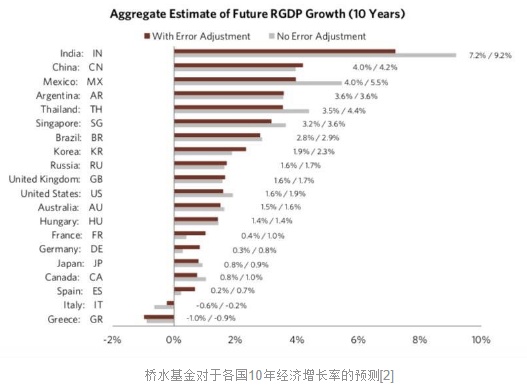 2014年的时候,因为我们的投资策略,我开始预测一些国家的经济增长率。我们使用类似的方法来研究了许多案例,以期找到经济增长的驱动因素,并提出了一些普适性的指标来预测这些国家在10年内的经济增长率。在此过程中,我对不同国家的经济表现好坏优劣的原因有了更深入的了解。在将这些指标整合到了量表和公式当中后,我们可以对全球20个最大的经济体进行10年的经济增长估算。除了对我们的投资决策有帮助外,我还认为这项研究可以帮助各经济体中的相关决策者。因为他们如果能够看到这些普适性的因果关系,那么就可以提前知道,如果改变X,将会在未来产生Y效应。我还看到,相对于中国和印度等新兴大国,美国的这些10年经济指标(例如教育质量和负债水平)正在不断恶化。