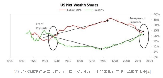 在这两个时期中,巨大的财富和收入差距导致了高度的政治两极分化,其形式是更大规模的民粹主义的出现。以及,由【社会主义者】领导的主张改革(left)激进民粹主义者,和【资本主义者】领导的主张保守的(right)激进民粹主义者之间的斗争。当新兴大国(比如1930年代的德国和日本)日益挑战现有的世界大国时,这些国内冲突就会慢慢升温发芽。