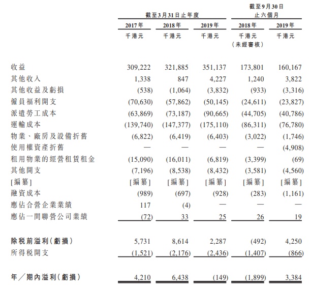 收益由截至2018年9月30日止六个月约1.74亿港元减少约7.8%至截至2019年9月30日止六个月约1.6亿港元,主要由于Top Global Express Carrier的货运量减少及为德国快递企业提供的运输服务的车程数目减少。